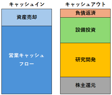 そのような変化の胎動が中期経営計画資料や統合報告書の中で起きている。それがキャッシュアロケーションに関するグラフの有無である。読者の中にはキャッシュインフローとキャッシュアウトフローとが下図のように対置されているグラフを見たことがある方も多いであろう。
