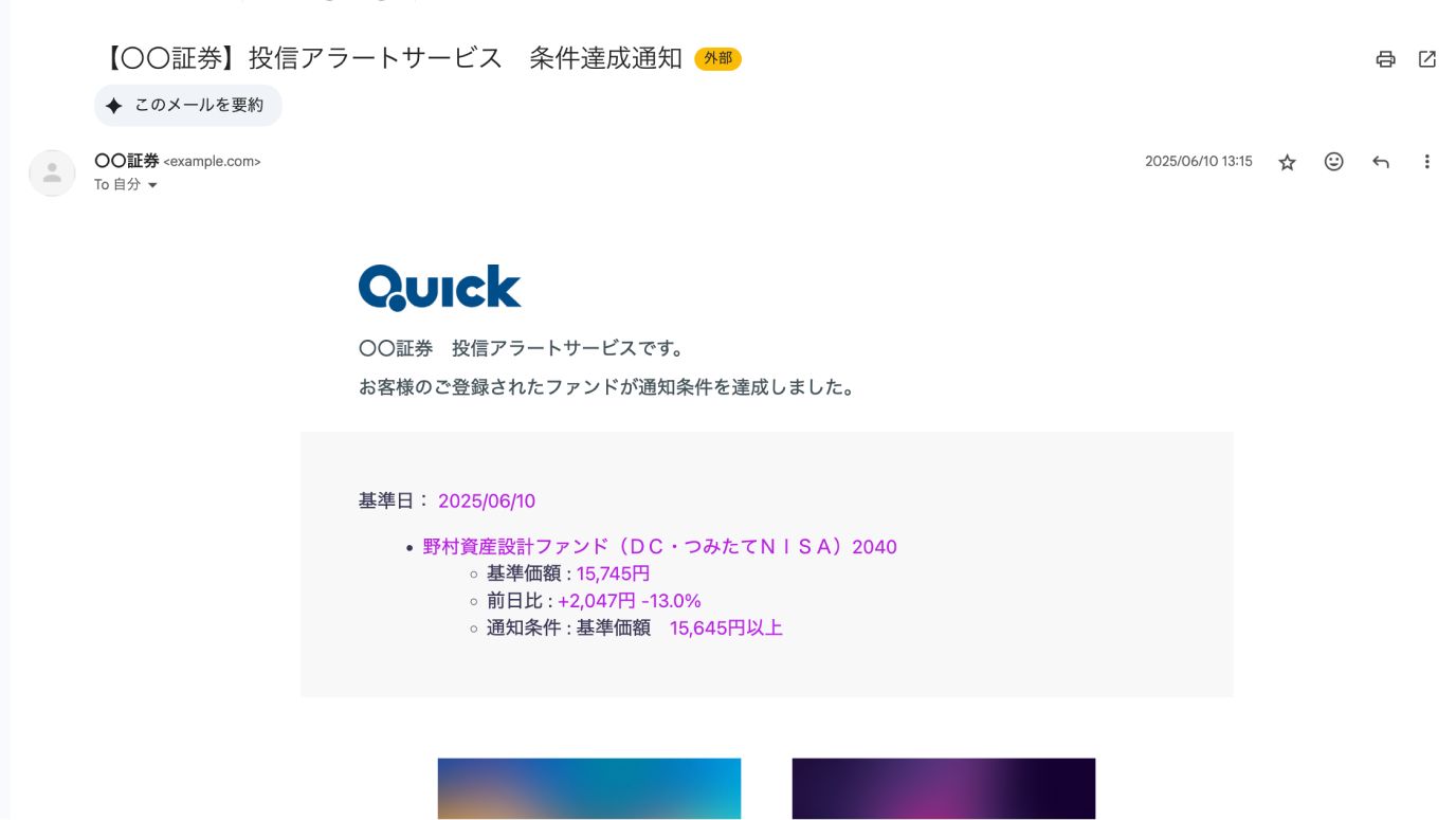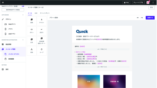 お客さまへ発信するメールの文面を編集できます。ファンド名や基準価額などQUICKによるアラート部分は自動編集。それ以外のヘッダー、フッター、本文の文言やデザインは貴社オリジナルに加工・編集が可能で、広告なども挿入できます。