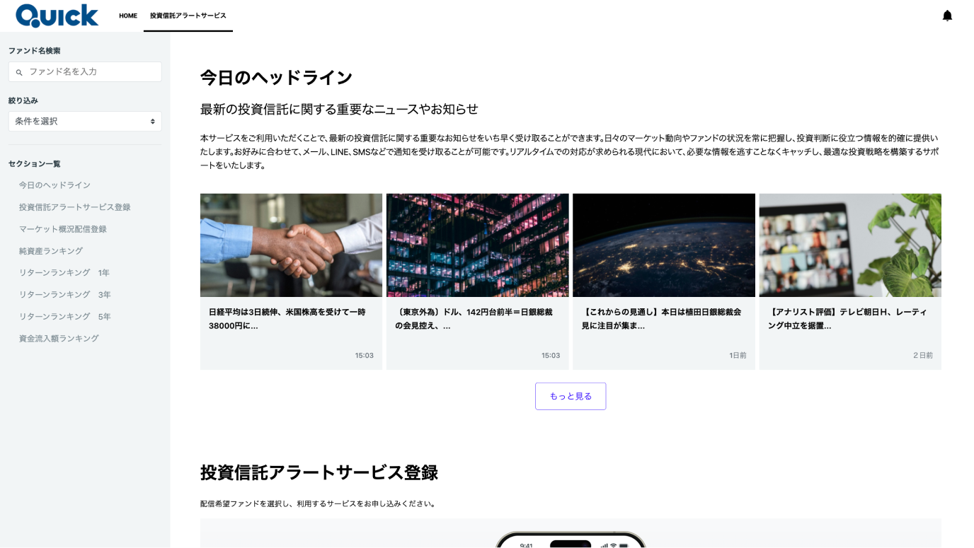 「QUICKシン・アラートサービス」は、投資信託(以下、投信)顧客のアフターフォローに特化したアラート自動配信マーケティングオートメーションサービスです。