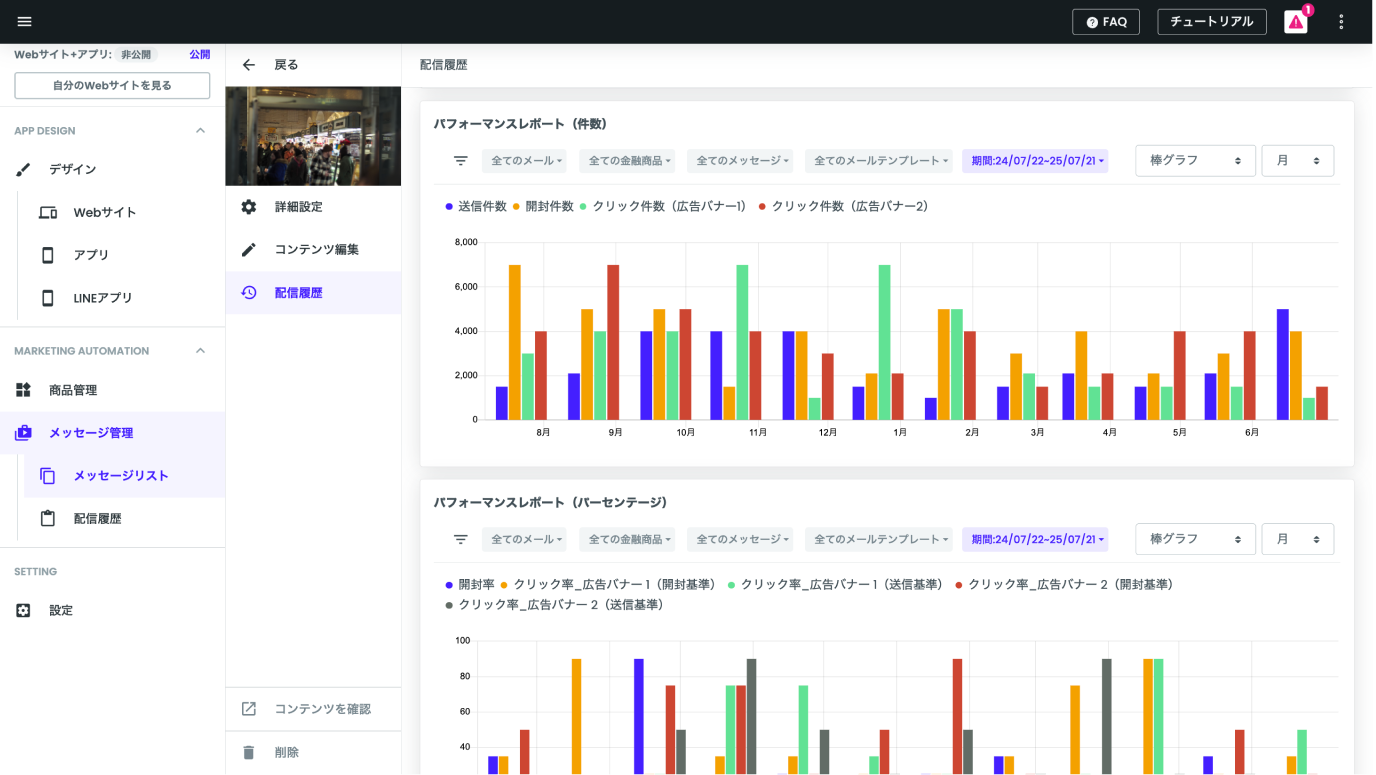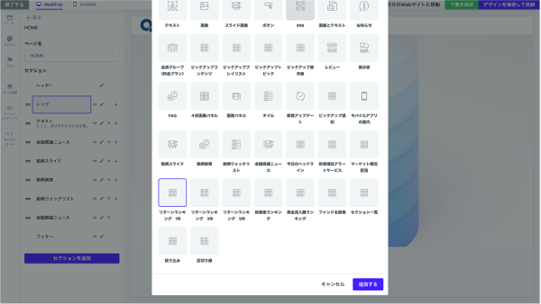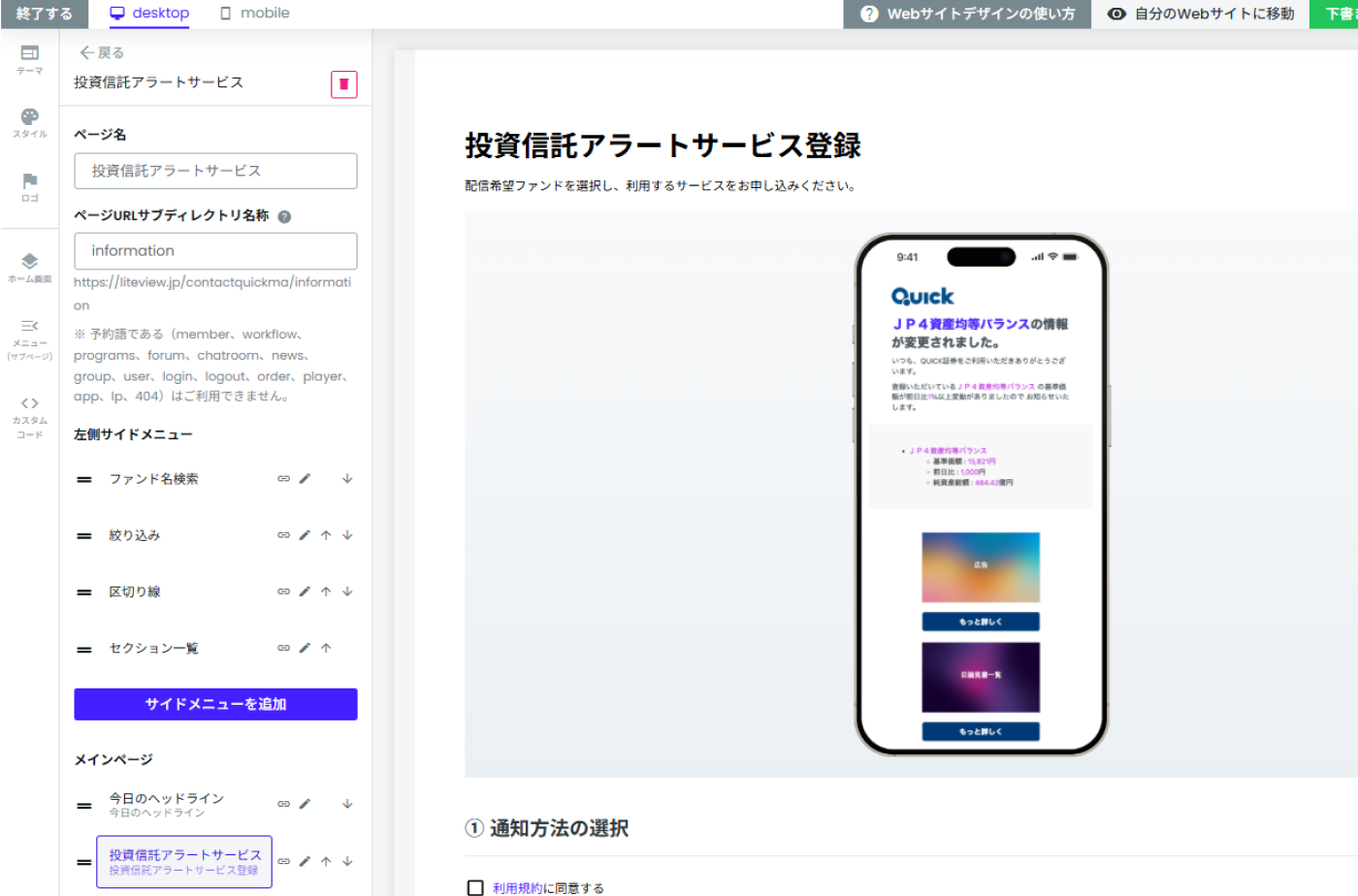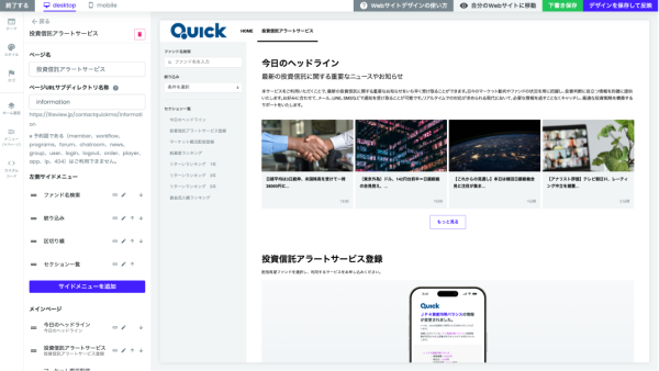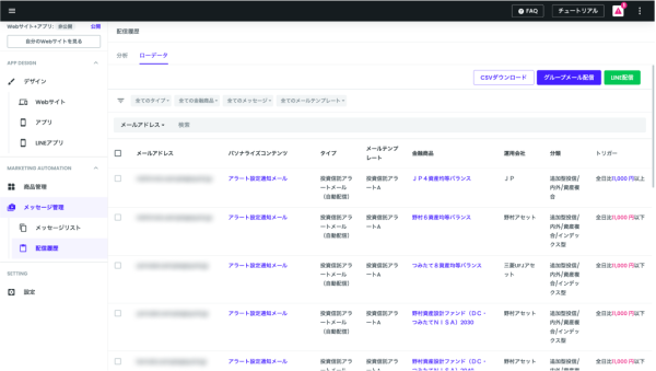 一般的なMAツールでもメール配信やランディングページ(以下、LP)の作成は可能ですが、金融市場データと連動して自動でメッセージを送る機能は通常ありません。本サービスでは、プログラミング不要でLPを作成でき、投信ランキングやニュースなどの金融情報をLPに組み込めます。