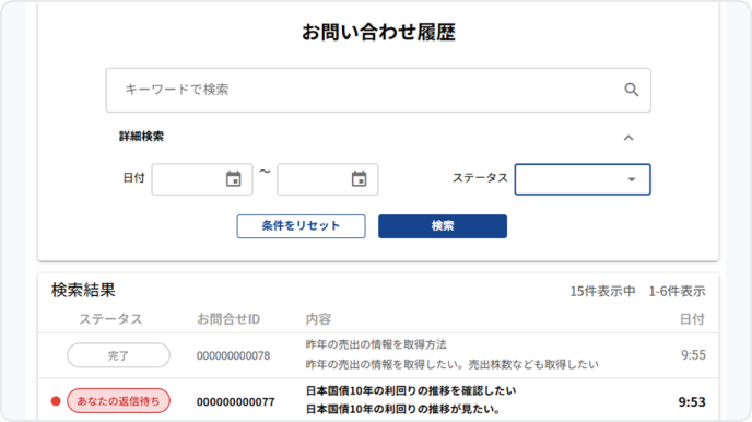 お問い合わせいただいた内容は履歴として蓄積されていくため、お客さま専用の「業務に役立つ知識・情報集」が完成します。お問い合わせ履歴は、キーワードや5段階のステータスで絞り込み・検索することができます。